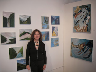ng hallways of Building 101, we noticed a definite trend of some very gifted artists to varnish their paintings to make them look glossy. Stacy Dynan was one of them. Her whimsical style is particularly interesting. She describes herself as "exploring the dynamic interplay between transparent and opaque elements, often applying her colors in dozens of layers to achieve the particular depth and radiance she desires." True, her paintings did have a silky depth and looked like they were springing out of the canvas.